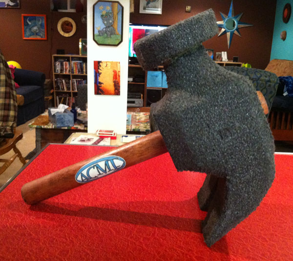 A few weeks before the show opened, Mrs. Me handed over a yoga block and said, “can you make something that looks like a hammer, but is safe to knock against someone’s noggin?”